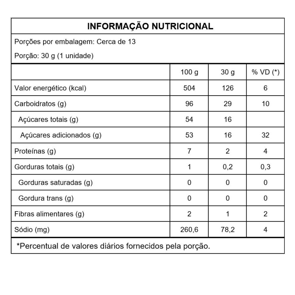 Ingredientes: Farinha de trigo, (enriquecida de ferro e ácido fólico, emulsificante). Açucar invertido, açucar, mel, clara de ovo, bicarconato de sódio (503ii), bicarbonato de amônia (500ii), ácido cítrico, acidulante 330, metabissulfito de sódio, (glacê aromatizado artificialmente com sabor chocolate e corante artificial). CONTÉM GLUTÉN. ALÉRGICOS: CONTÉM MEL, DERIVADOS DE TRIGO. PODE CONTER AVEIA, CEVADA, OVO, SOJA E DERIVADOS DE LEITE