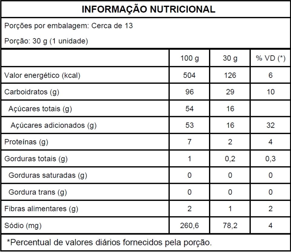 Ingredientes: Farinha de trigo, (enriquecida com ferro e ácido fólico, emulsificante). Açúcar invertido, açucar, mel, clara de ovo, bicarbonato de sódio (503ii) bicarbonato de amônia (500ii), ácido cítrico, acidulante 330, metabissulfito de sódio. CONTÉM GLUTÉN. ALÉRGICOS: CONTÉM MEL, DERIVADOS DE TRIGO. PODE CONTER AVEIA, CEVADA, OVO, SOJA E DERIVADOS DE LEITE