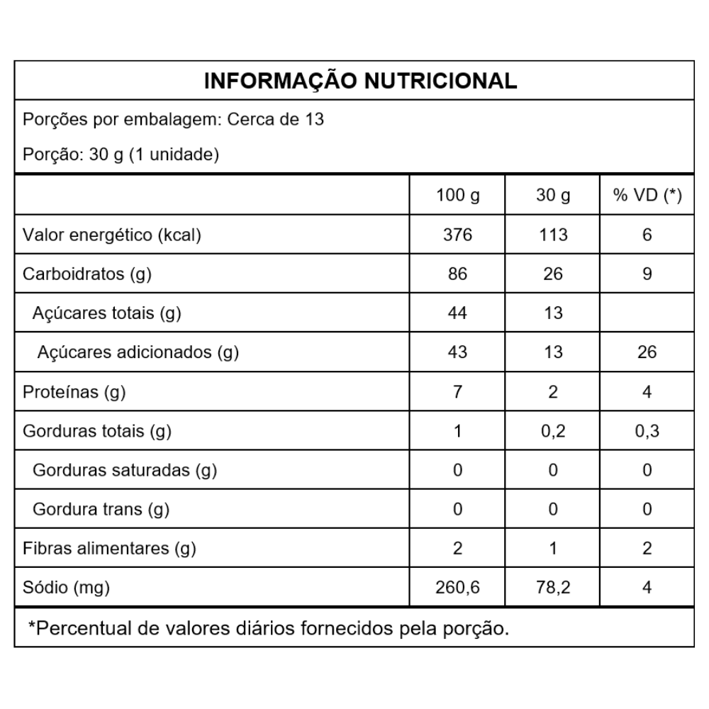 Ingredientes: Farinha de trigo , (enriquecida com ferro e ácido fólico, emulsificante). Açúcar invertido, açúcar, mel, bicarbonato de sódio (503ii), bicarbonato de amônia (500ii), ácido cítrico, acidulante 330, metabissulfito de sódio. CONTEM GLUTÉN. ALÉRGICOS: CONTÉM MEL, DERIVADOS DE TRIGO, PODE CONTER AVEIA, CEVADA, OVO, SOJA E DERIVADOS DE LEITE